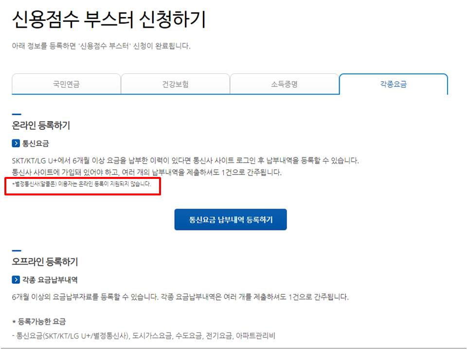 하지만 별정통신사(알뜰폰)는 온라인으로 등록이 되지 않는다고 명시가 되어 있습니다.