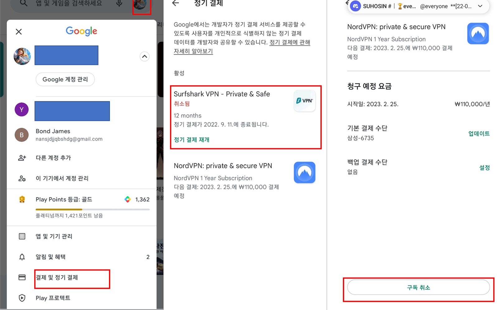 구독취소는 본계정으로 재접속 후 결제 및 정기결제를 선택해줍니다.