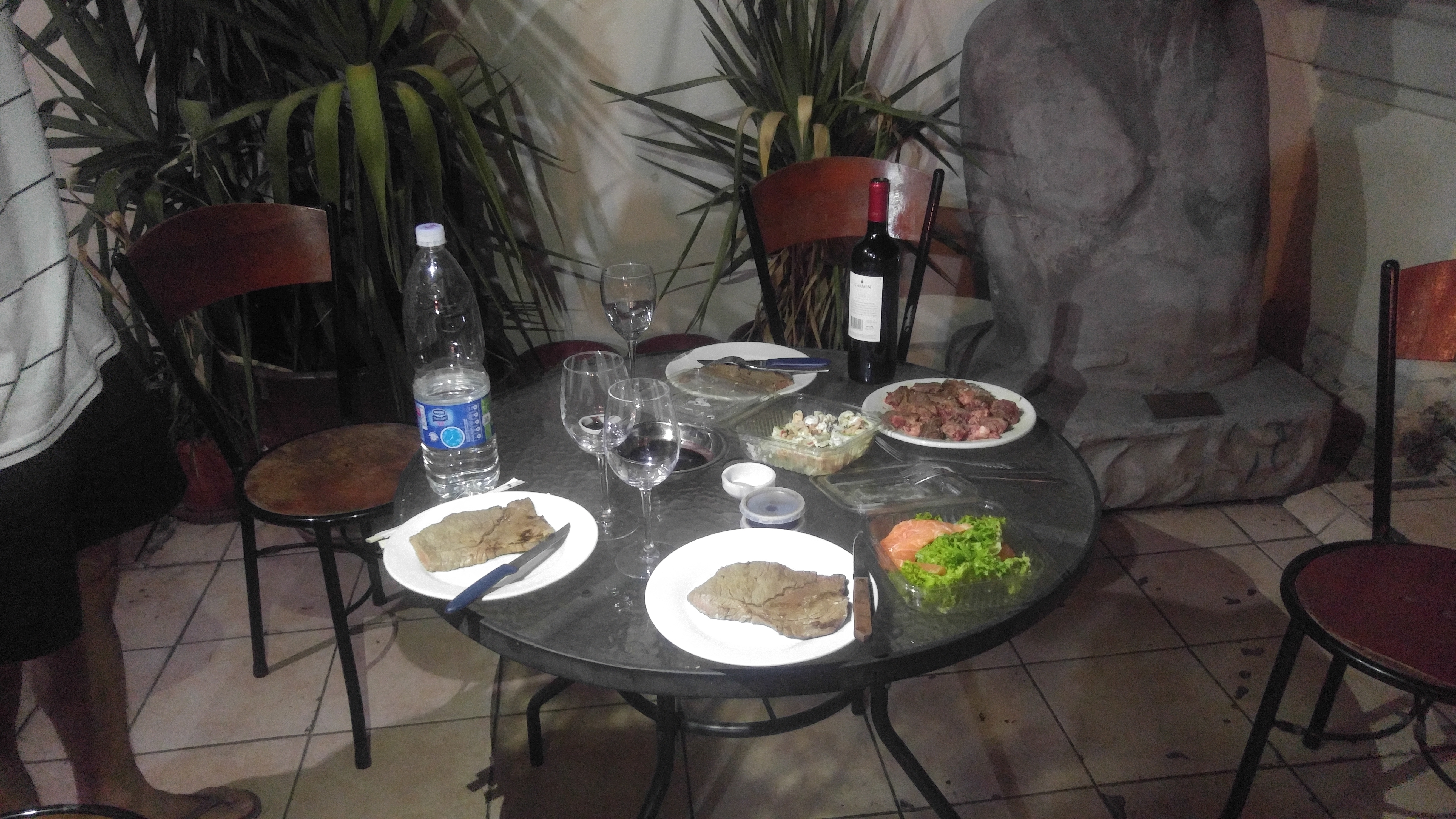 그렇게 칠레의 마지막 밤을 보내는 파티가 시작되었습니다. 보이시나요? 두리 스시에서 포장해온 음식들이?? 칠레와 아르헨티나는 수산물과 육가공 제품들이 풍부해서 적은 돈으로도 배부르게 먹을 수 있습니다. 와인도 인근 슈퍼마켓에서 하나 샀어요^^